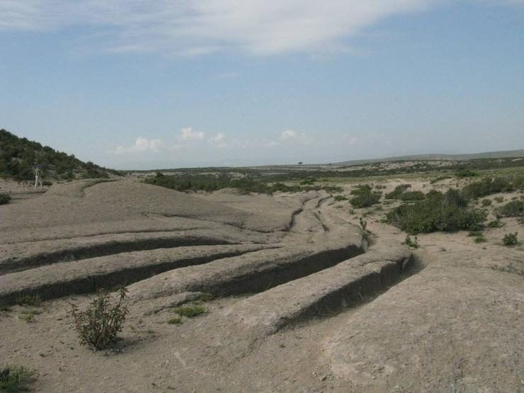 Решив выяснить возможность объезда, мы вышли из автомобиля и… раскрыли рот от удивления. Колеи этой и соседних с ней «дорог» представляли собой окаменевшие следы колес в каменных туфогенных породах. Судя по всем признакам, – неогеновая поверхность выравнивания. И эти каменные просторы оказались покрыты следами колес, которые проехали здесь много миллионов лет назад.