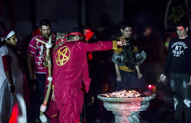 После жертвоприношения и песнопений шаманы вместе с новыми последователями черной мессы зашли в подземную пещеру, украшенную перевернутыми крестами, скелетами животных и большой статуей Сатаны.