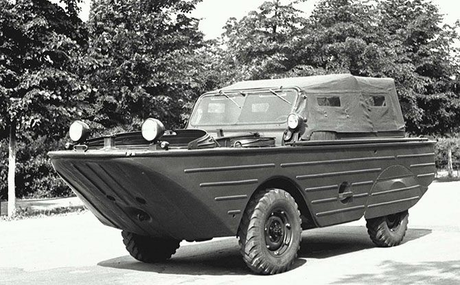 «МАВ» расшифровывалось как Малый Автомобиль Водоплавающий. Эту оснащенную четырехцилиндровым двигателем от «Победы» и трансмиссией и подвеской от ГАЗ-69 машину начали выпускать в 1953 году. По воде ГАЗ-46 передвигался с помощью гребного винта. Назначение вполне стандартное: переправа десантников, инженерные работы на воде и прочие военные миссии. Модель была скопирована с американского Ford GPA и просуществовала до 1958 года.