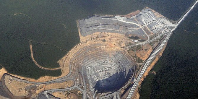 «Маленькие здания» слева на снимке — на самом деле, большие заводские цеха — помогают передать масштаб золотодобычи в Сибири.