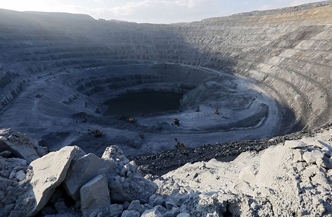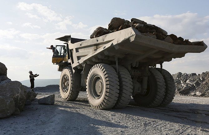 Здесь трудятся самосвалы Катерпиллер грузоподъемностью 136 тонн, а также Терекс и Комацу.