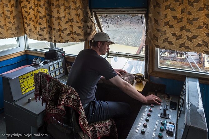 Всей драгой управляет один человек. Он сидит наверху и руководит процессом с пульта: