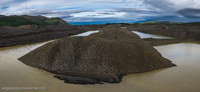 В одних местах был просто снят верхний золотоносный слой земли, в других всё было изрыто до неузнаваемости. Типичная картина: перемытая порода собрана в кучи и брошена как есть: