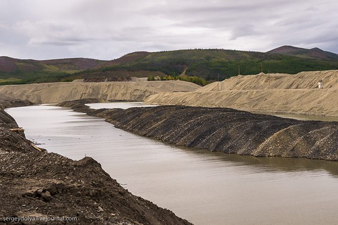 Практически везде, где мы проезжали и видели речку, находили перерытые участки. Это последствия добычи драгоценного металла (речная вода в этом процессе – важный компонент):