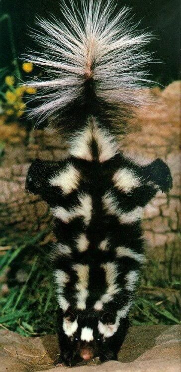 Пятнистый скунс делает стойку на руках, чтобы отпугнуть хищника.