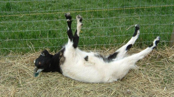 Это домашние козы, известные как миотонические, у которых в результате паники мышцы оказываются парализованными примерно на десять секунд. Обычно это заканчивается тем, что коза падает на бок.