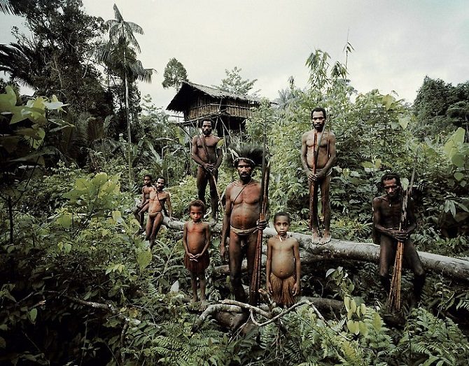 Короваи – папуасское дикое племя, обитающее в юго-восточной части индонезийской провинции Папуа. О них мы давеча отдельно рассказывали. Их насчитывают около 3000 людей, до 70-х годов они не видели белых людей, и они не носят котеки. Зато мужчины прячут член в мошонке и сверху крепко привязывают лист. Они строят жилища на деревьях и занимаются охотой и собирательством. У них главенствует строгий сепаратизм между мужчинами и женщинами.