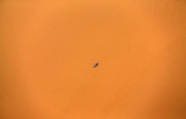 Оранжевые или красные отходы из прорванной дамбы включают в себя ртуть, мышьяк, хром и марганец. Побережье штата Эспириту-Санту на берегу Атлантического океана и маленькая лодка, 21 ноября 2015.