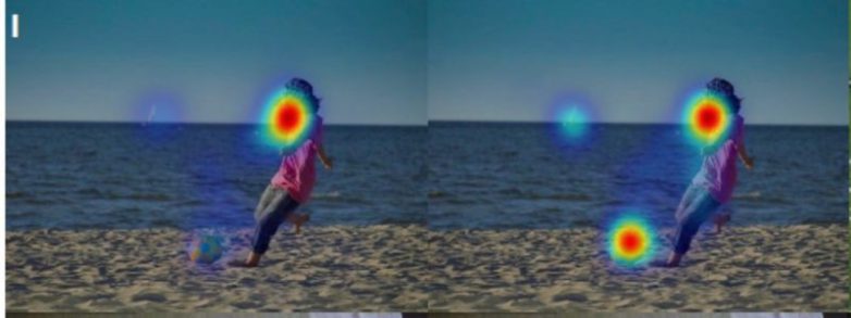 Красные зоны в изображениях – это наиболее просматриваемые области, к которым постоянно устремлялся взгляд испытуемых. Изображения, на которые смотрели аутисты – слева, а нейротипики – справа.