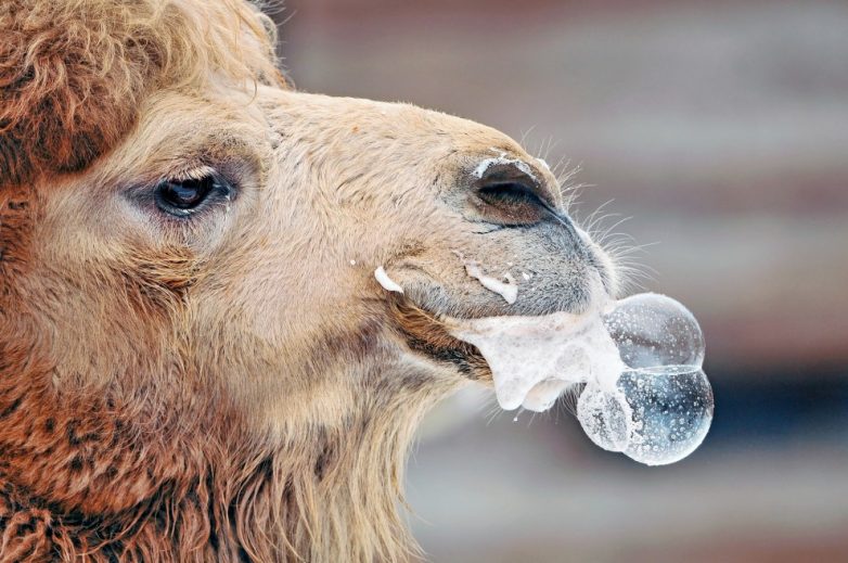 Самец одногорбого верблюда раздувает складку на мягком нёбе, похожую на розовый пузырь, до тех пор, пока она не начинает вываливаться изо рта, и это верный признак того, что самец готов к спариванию.