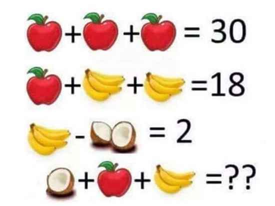 Корреспондент «МК» тоже решил поднапрячь свои арифметические способности. Так: три яблока равно тридцати, яблоко плюс две связки бананов – восемнадцать, две половинки кокоса минус связка бананов равно двум… Значит, в последнем уравнении пол-кокоса да яблоко, да связка бананов… – Ах да! В ней же не четыре банана, как других, а три! – Значит получаем… получаем 14.