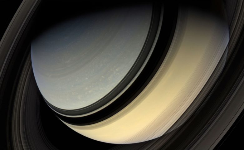 Фотография Сатурна, сделанная путем наложения 36 снимков друг на друга — использовались красные, зеленые и голубые фильтры. Cassini, октябрь 2005 года.