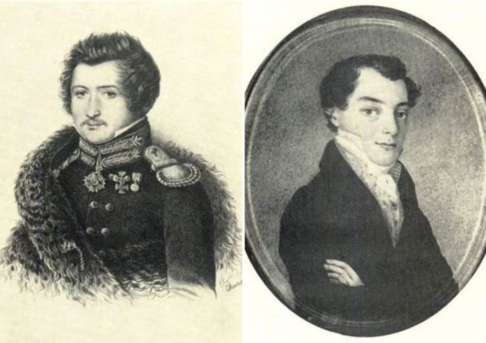 Слева – Скино. Портрет С. Муравьева-Апостола. Литография, 1857. Справа – неизвестный художник. Портрет К. Ф. Рылеева, 1826
