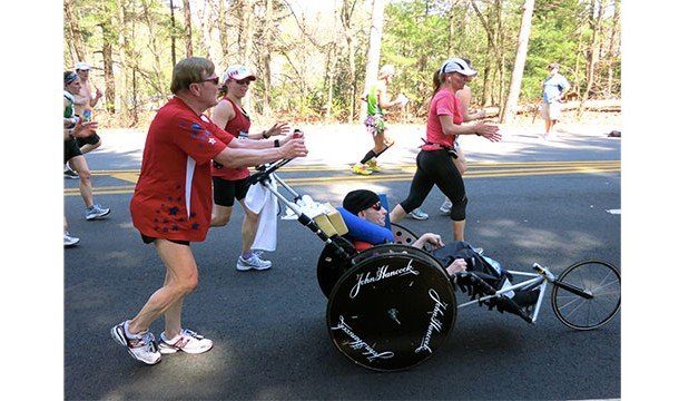 7. Дик Хойт (Dick Hoyt) пробежал 247 триатлонов вместе со своим сыном-инвалидом, неся его на руках или толкая инвалидное кресло, в котором он сидел.