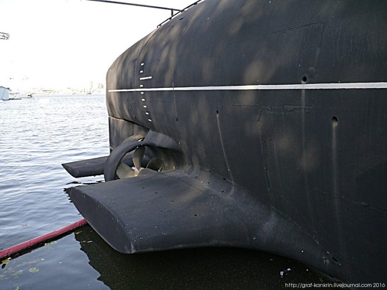 Подводная лодка установлена на подводное гидротехническое основание, корабль приподнят на 4 метра, что сделало открытым для обозрения винто-рулевой комплекс.