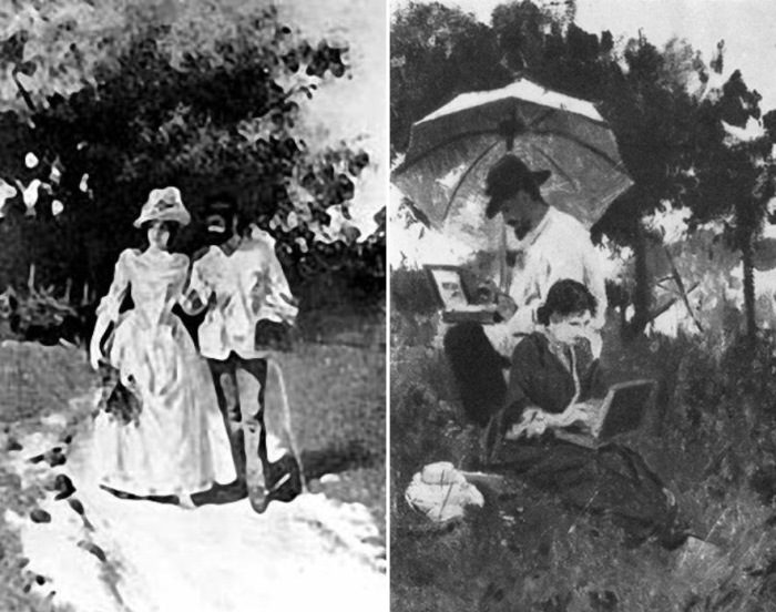 А. Степанов. Слева – *И. Левитан и С. Кувшинникова на прогулке в Плесе*. Справа – *И. Левитан и С. Кувшинникова на этюдах*, конец 1880-х гг.
