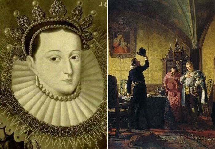 Слева – Марина Мнишек. Гравюра, 1609. Справа – Н. Неврев. Присяга Лжедмитрия І польскому королю Сигизмунду ІІІ на введение в России католицизма