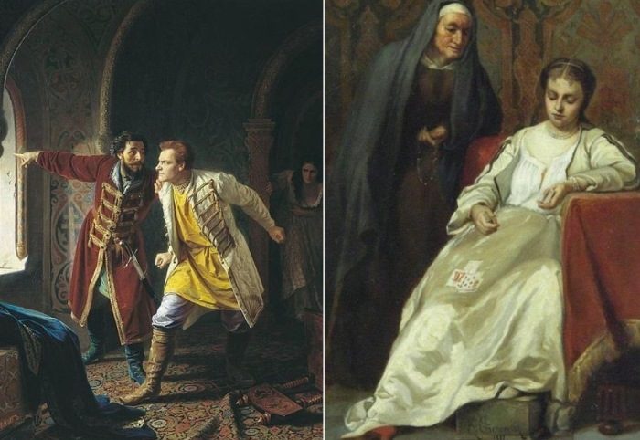 Слева – К. Вениг. Последние минуты жизни Лжедмитрий І, 1879. Справа – К. Степанов. Марина Мнишек перед постригом в монахини