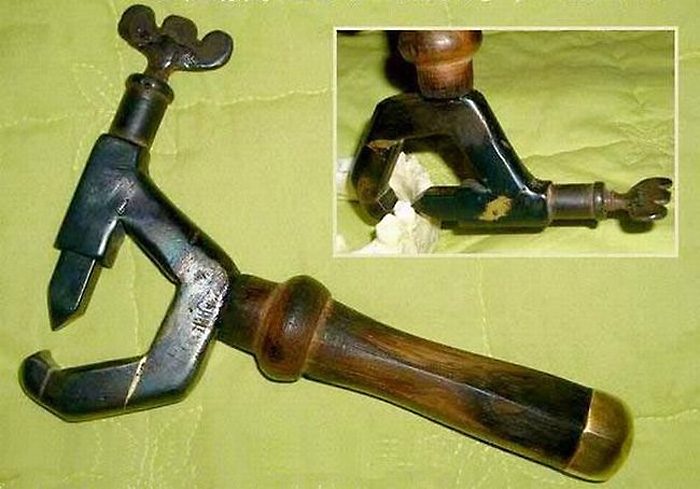 В середине XIX века были распространены разнообразные щипцы для выдергивания зубов. Одна из моделей может на кого угодно нагнать ужас. Речь идет о щипцах с винтовым шипом, который проникал в корень для более надежной фиксации и более эффективного удаления зубов.