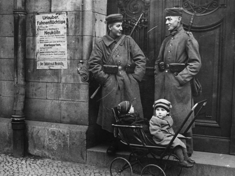 Немецкие полицейские приглядывают за детьми, стоя на посту. Фото сделано вскоре после Первой мировой войны.