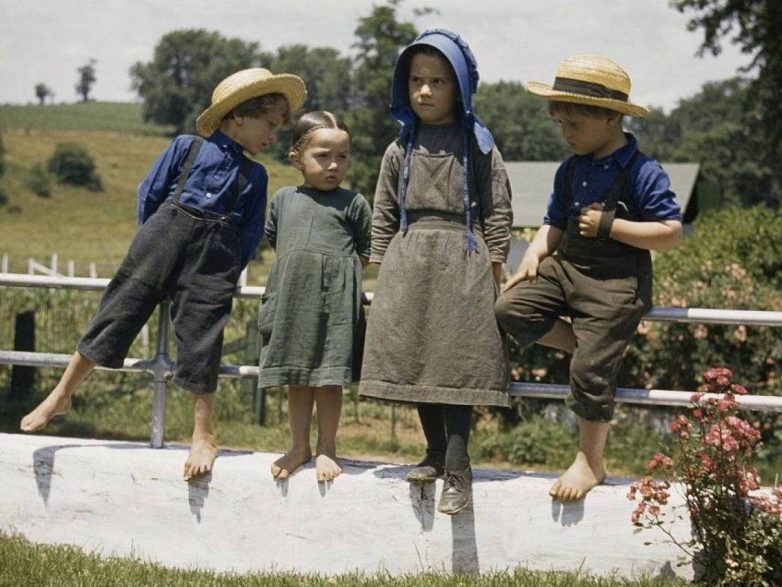 Маленькие амиши сидят на заборе в Пенсильвании.