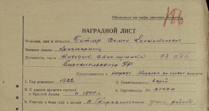 Да-да, вы не ослышались. Награду получил красноармеец-пулемётчик Семён Константинович Гитлер, еврей по национальности. В наградном листе было написано: «Будучи наводчиком станкового пулемета, поддерживал огнем наступление своего взвода. Оказавшись в окружении и получив ранение, товарищ Гитлер вел огонь, пока не израсходовал боеприпасы, после чего, не бросив оружия, выбрался к своим, в общей сложности уничтожив более сотни военнослужащих Вермахта».