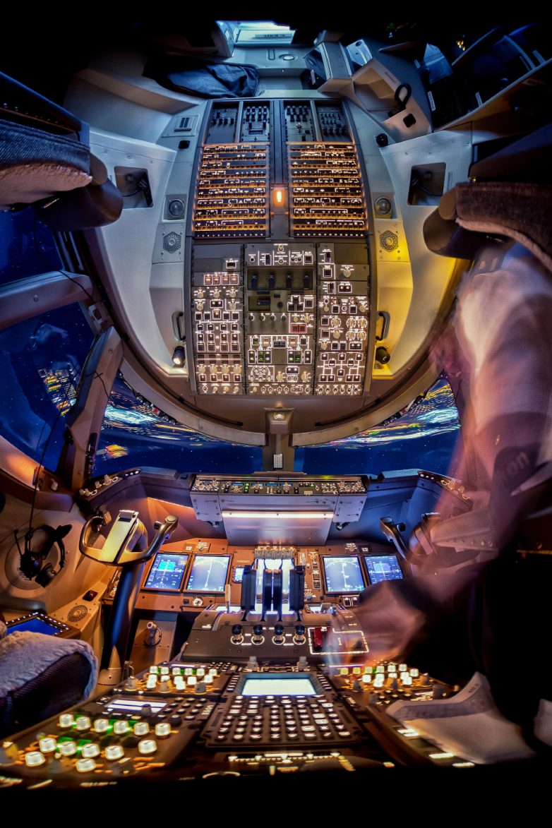 2. Съемка на длинной выдержке. С такого ракурса кабина самолета выглядит, как кабина космического корабля.