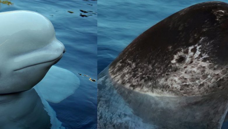 А вот так может выглядеть гибрид кита-белуги и нарвала. На иллюстрации — всего лишь предположение художника, однако, еще в 1980-ом году, охотники находили черепа, предположительно принадлежащие отпрыску этих двух видов. Существуют и незадокументированные свидетельства очевидцев, утверждающих, что видели подобное животное своими глазами.
