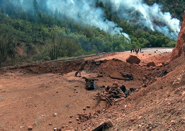 Это похоже на сцену из боевика: металлические осколки, потёртые куски шины и блок цилиндров — это всё, что осталось от грузовика, перевозившего 38.000 фунтов (17,24 т) взрывчатых веществ, после того, как его груз сдетонировал на трассе I-6 в каньоне Spanish Fork Canyon, штат Юта, США, в 2005 году.