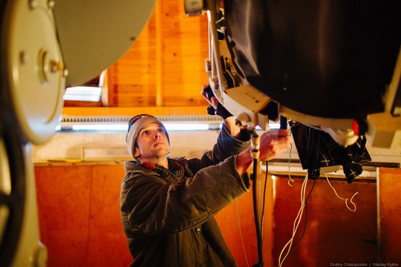 С туристами, кстати, у нас тут проблема: в первые 10 лет работы приходилось отбиваться от них. Да и сейчас тоже заходят. Дело в том, что в советское время здесь был почти народный альплагерь, т. е. заходи кто хочешь, можно переночевать или чуточку пожить бесплатно. И вот приходят сюда какие-то люди, мол, мы тут раньше отдыхали. А в 90-е, когда инфляция была жуткая, денег не платили, мы ездили их добывали, телескоп тут собирали — одним словом кутерьма была и совсем не до этого. И вот мы тут сидим на холоде под куполом, поем под Чиж и К «… холодно в кедах, но это фигня, ветер уносит последние деньги…», «козел» обдувает нас горячими струями воздуха, а мы собираем и паяем вот эту старую систему управления телескопом, полы вот эти делаем… И тут приходят люди, мол, мы тут будем у вас ночевать, пить, есть и т.д. Более того, экскурсоводы собирали внизу деньги и поднимали сюда группы людей, якобы на экскурсию в обсерваторию. Приходилось гонять. Но это, конечно, неприятно: ходить, гавкать, ругаться. Но с другой стороны, приходит кто-то в 11 часов, а у тебя рабочая ночь (где-то 14-16 часов) закончилась. Мы начинаем примерно в 4 вечера и заканчиваем в 9 утра. И вот, только ты лег спать, нужно поспать 3 часа и опять бежать, потому что у тебя что-то не ладится — а тут туристы приходят, нужно с ними гавкаться, портить настроение и… ну, одним словом, неправильно все это.