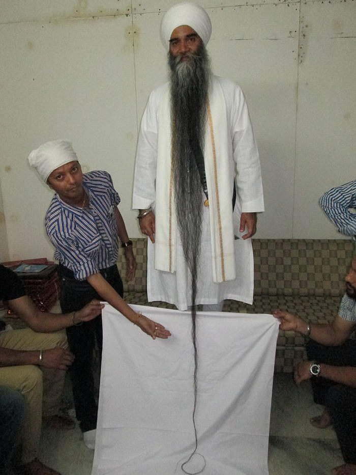 Индус Бхаи Сарван Сингх, живущий в Канаде, является обладателем самой длинной бороды в мире. Ее длина составляет 2,49 м.