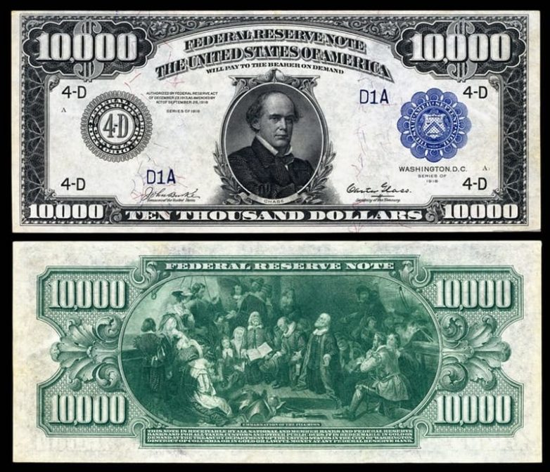 Когда-то выпускалась банкнота номиналом 10000 долларов с изображением Салмона Портленда Чейза, министра финансов США при президенте Линкольне. Такие банкноты печатали и пускали в свободное обращение до 1934 года. Сегодня это большой раритет.