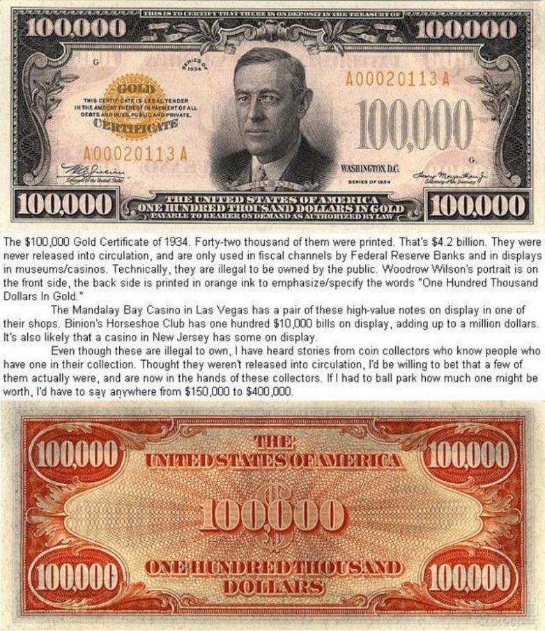 В 1934 году правительство США выпустило золотой сертификат на 100 000 долларов, но буквально через месяц решило отозвать его из-за экономических рисков. На этой банкноте был изображен президент Вудро Вильсон и использовалась она только для финансовых операций между Федеральным резервом и банками. В свободное обращение не поступала.