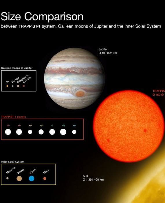 Орбиты планет должны находиться гораздо ближе к звезде, чем в Солнечной системе, чтобы на их поверхности могла существовать вода. К счастью, у TRAPPIST-1 именно такая компактная конфигурация системы». Планеты получили названия TRAPPIST-1b, c, d, e, f, g, а также h. TRAPPIST-1b представляет собой планету, которая находится ближе всего к красному карлику, а h – самая удаленная планета в системе. Система TRAPPIST-1 намного меньше, чем Солнечная система, и каждый из семи миров, вращается вокруг своей звезды ближе, чем Меркурий по отношению к Солнцу.