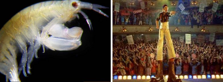 Креветка Leucothoe eltoni и Элтон Джон в образе Pinball Wizard. Крошечное ракообразное было обнаружено на коралловых рифах Индонезии и Филиппин. Его открыватель так объясняет происхождение оригинального названия: «Я назвал этот вид в честь сэра Элтона Джона, потому что слушал его музыку в лаборатории на протяжении всей своей научной карьеры. А увидев это необычное ракообразное с сильно увеличенными конечностями в микроскоп, я сразу вспомнил огромные ботинки Элтона Джона из клипа Pinball Wizard».