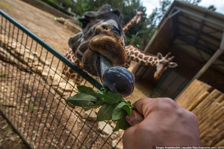 Язык у них черного цвета и длиной почти 50 см, он настолько подвижен, что жираф может кончиком языка ковырять в ухе.