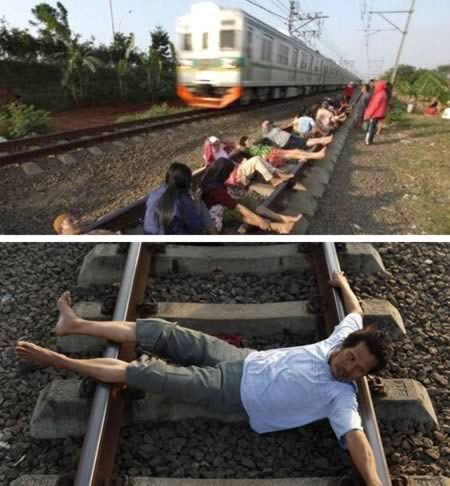 Очень странный метод лечения практикуется в Индонезии: каждый день люди лежат на железнодорожных рельсах, в надежде, что электрическая вибрация от приближающегося поезда исцелит их от болезней. Этот народный метод появился благодаря легенде об отчаявшемся китайце, который хотел было покончить с собой и расположился на рельсах, но тут внезапно почувствовал, что его тело чудесным образом избавилось от страшного недуга.