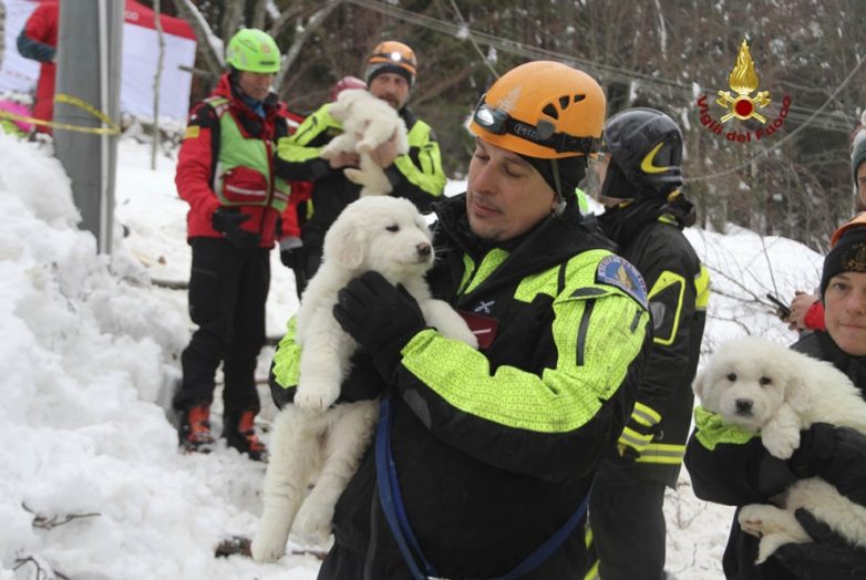 Пожарные со щенками, найденными под завалами в отеле Hotel Rigopiano, на который обрушилась лавина, в коммуне Фариндола в Италии, 22 января 2017 года.