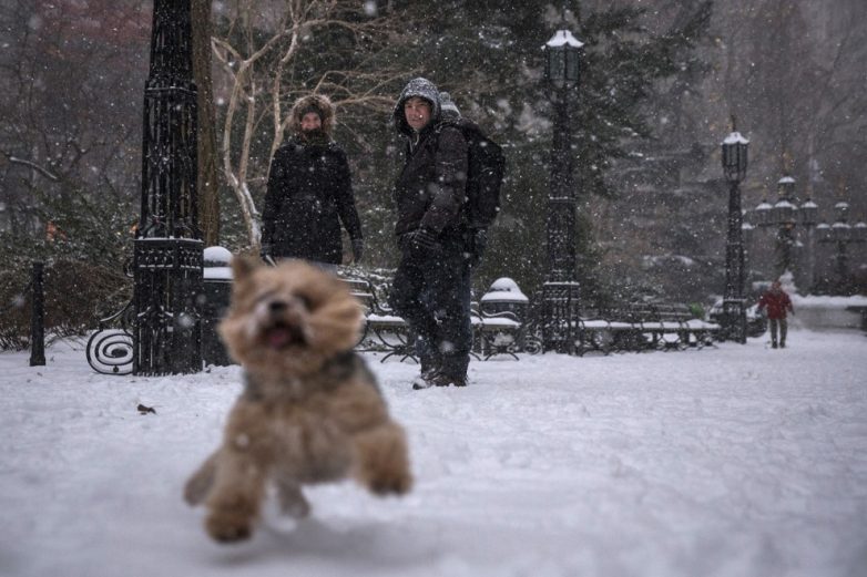 Щенок резвится в снегу во время метели на Манхэттене в Нью-Йорке, 26 января 2015 года.