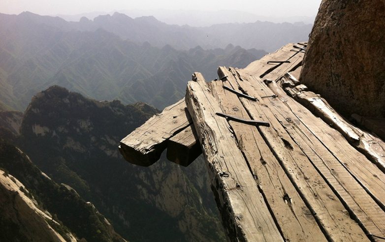 Хуашань — одна из пяти Священных Гор даосизма в Китае. Подъем от Северной вершины горы (1614 м) к Южной (2154 м) составляет 14 км, часть пути преодолевается по специально вымощенным ступеням, а оставшееся расстояние — по «тропе смерти», самой опасной тропе в мире, состоящей всего из трех ветхих с виду деревянных досок. Держаться придется за цепи, прикрепленные к скале, никаких ограждений нет. Каждому экстремалу выдается пояс с тросом и карабином, который крепится на канате, идущем через весь путь. Вознаграждение за смелость — незабываемые виды на долину, монастыри и древние храмы.