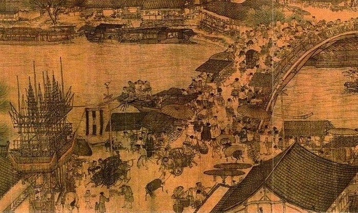 Китайская рыночная площадь с магазинчиками и киосками. Крупный план части картины Зханг Зедуана (1085-1145)