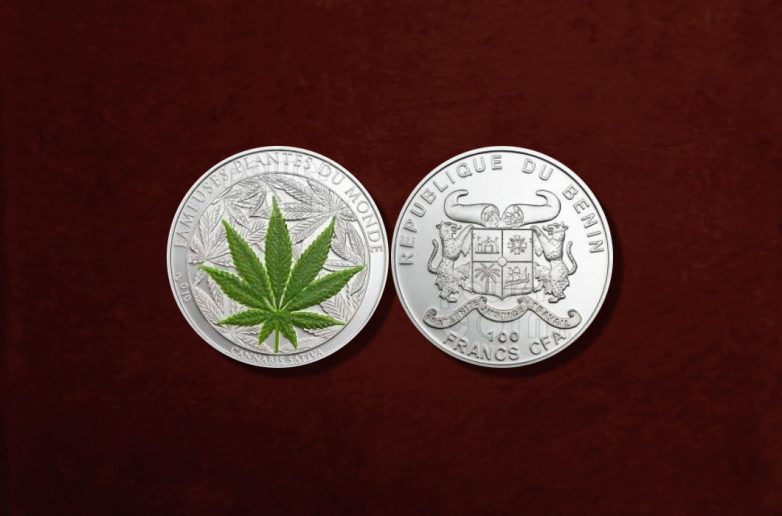 В Бенине в 2011 году выпустили монеты в форме листьев конопли. Кроме необычной формы они обладают еще одной примечательной особенностью: изображение листа на реверсе при трении источает запах каннабиса. Производитель уверяет, что это аромат синтетической добавки, а не экстракта настоящего растения.