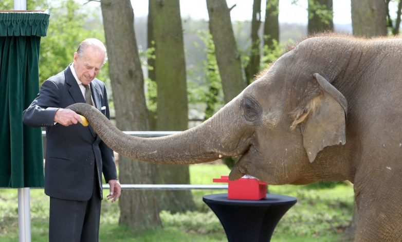 Принц кормит слона во время визита в зоопарк.