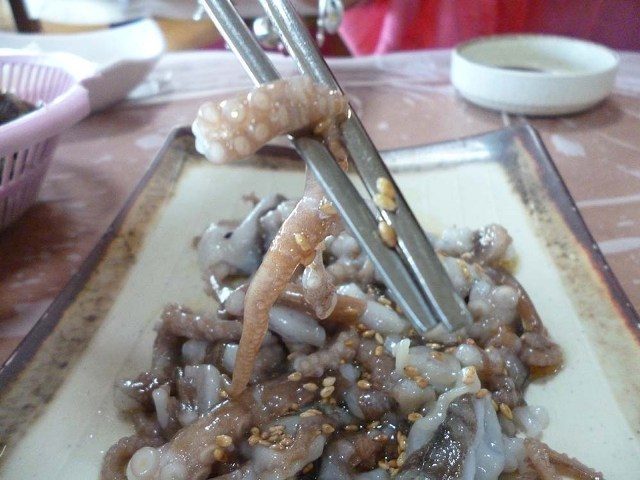 Саннакчи – это традиционное корейское блюдо. Живого осьминога обдают кунжутным маслом, а затем присыпают семенами кунжута.