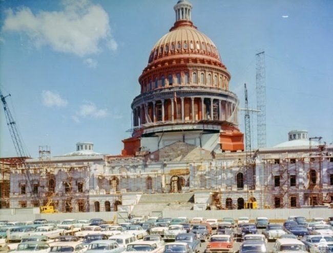 Здание Капитолия окрашивают красной антикоррозийной краской, чтобы затем снова перекрасить его в белый цвет, 1959 год.