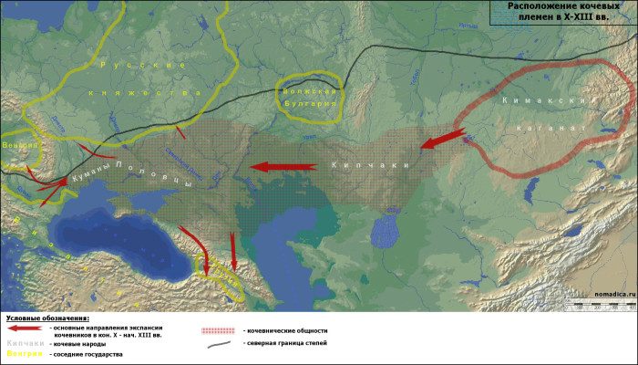 В степи (Дешти-Кипчак – Кипчакская, или Половецкая степь) жили не только половцы, но и другие народы, которых то объединяют с половцами, то считают самостоятельными: например, куманы и куны. Скорее всего, половцы не были «монолитным» этносом, а делились на племена. Арабские историки раннего Средневековья выделяют 11 племен, русские летописи также свидетельствуют о том, что разные племена половцев жили западнее и восточнее Днепра, восточнее Волги, около Северского Донца.