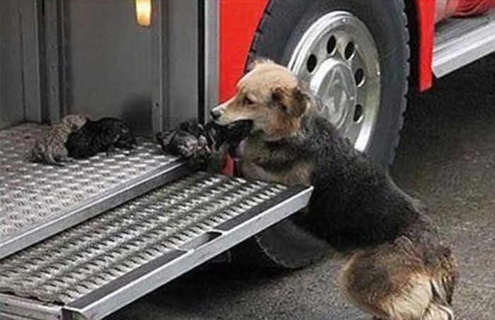 Собака самостоятельно вынесла своих щенков из горящего здания и принесла их в самое безопасное место – к пожарной машине, поближе к людям.