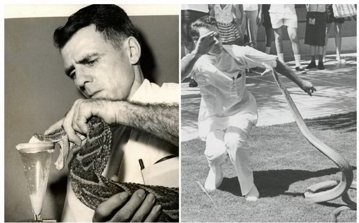 Слева – сцеживание змеиного яда; справа – выступление перед публикой.