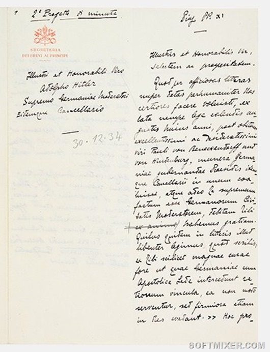 Письмо папы Пия XI Адольфу Гитлеру в ответ на его послание, в котором рейхсканцлер Германии выразил надежду на укрепление связей с Ватиканом, 1934 год.