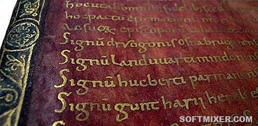 Пурпурный пергамент, тисненный золотом, с описанием даров императора Священной Римской империи Оттона I церкви, 950 год.